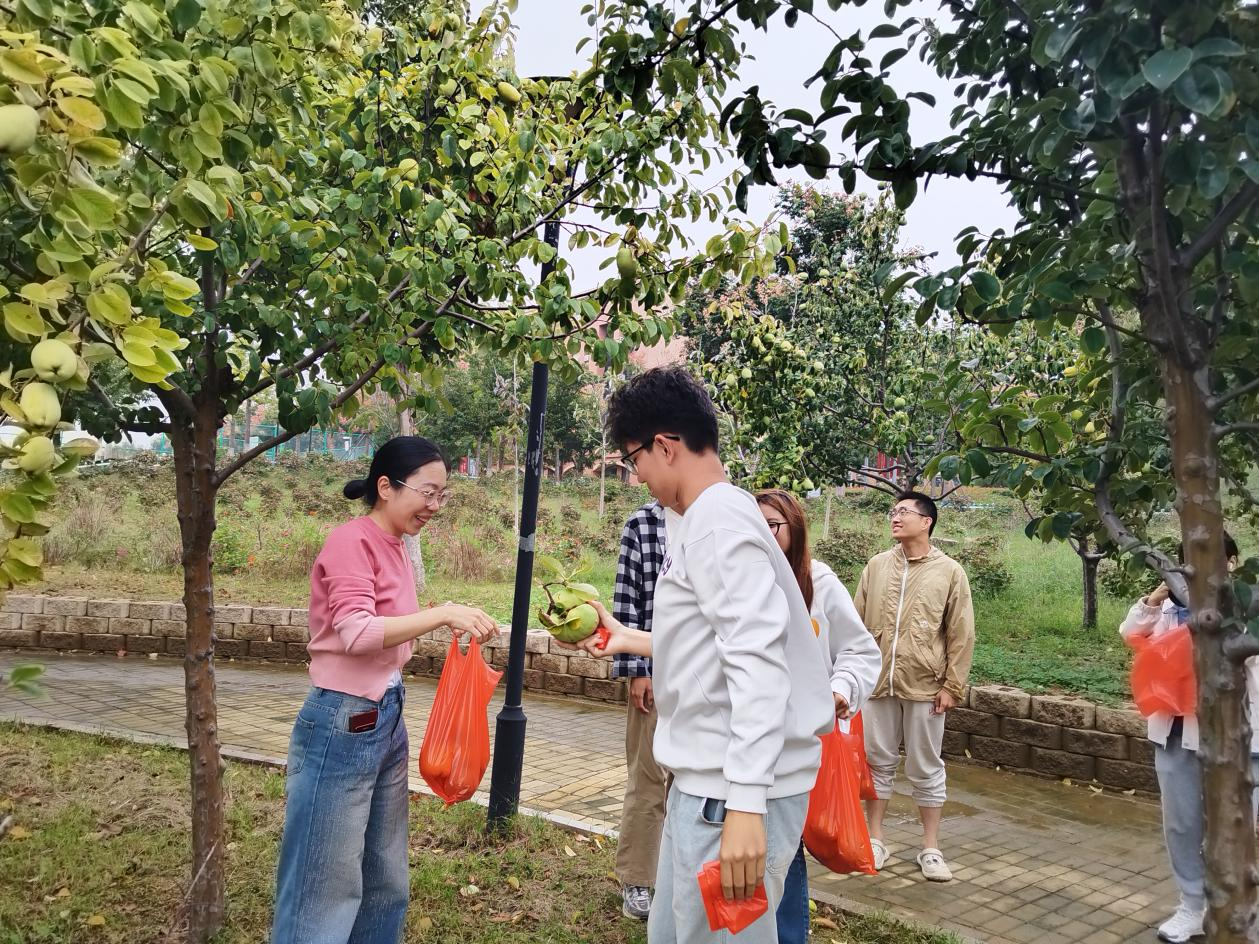 活动现场,木瓜海棠果实盈枝,学生在后勤工作人员指导下分工协作、默契配合,在亲手劳作中体验收获喜悦,共同参与一堂劳育实践课,感悟劳动创造的价值与美好。